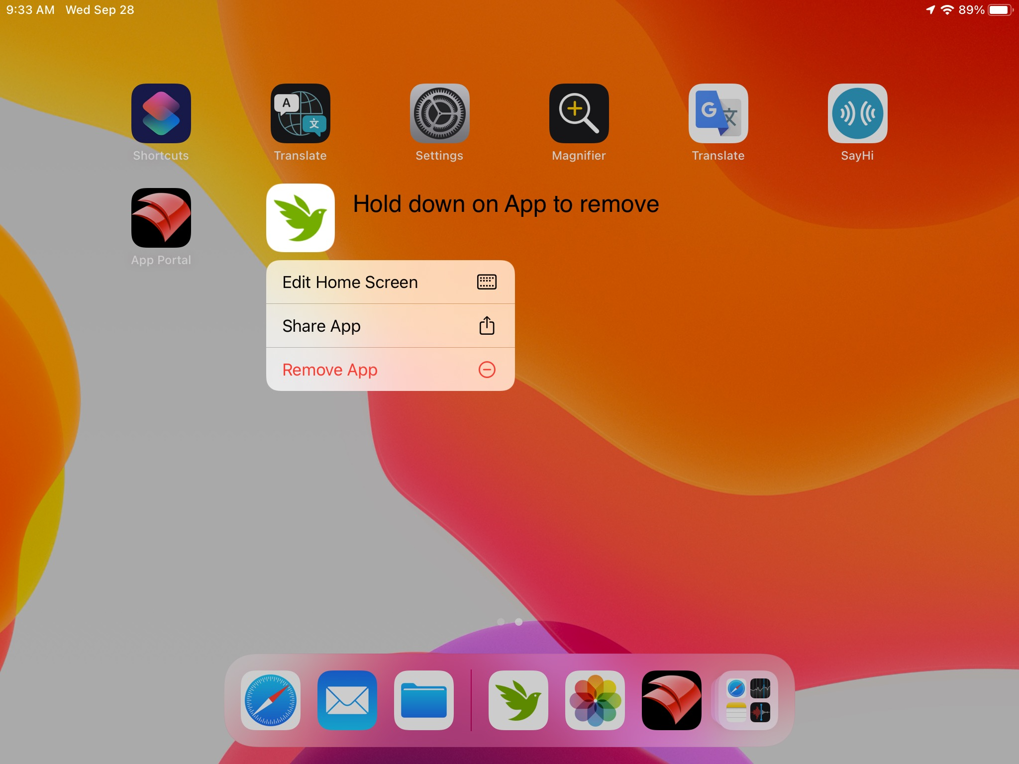 To delete the App, hold down on App icon until Pop-up Box appears. Tap on Remove App. (Shown in the picture below.)
