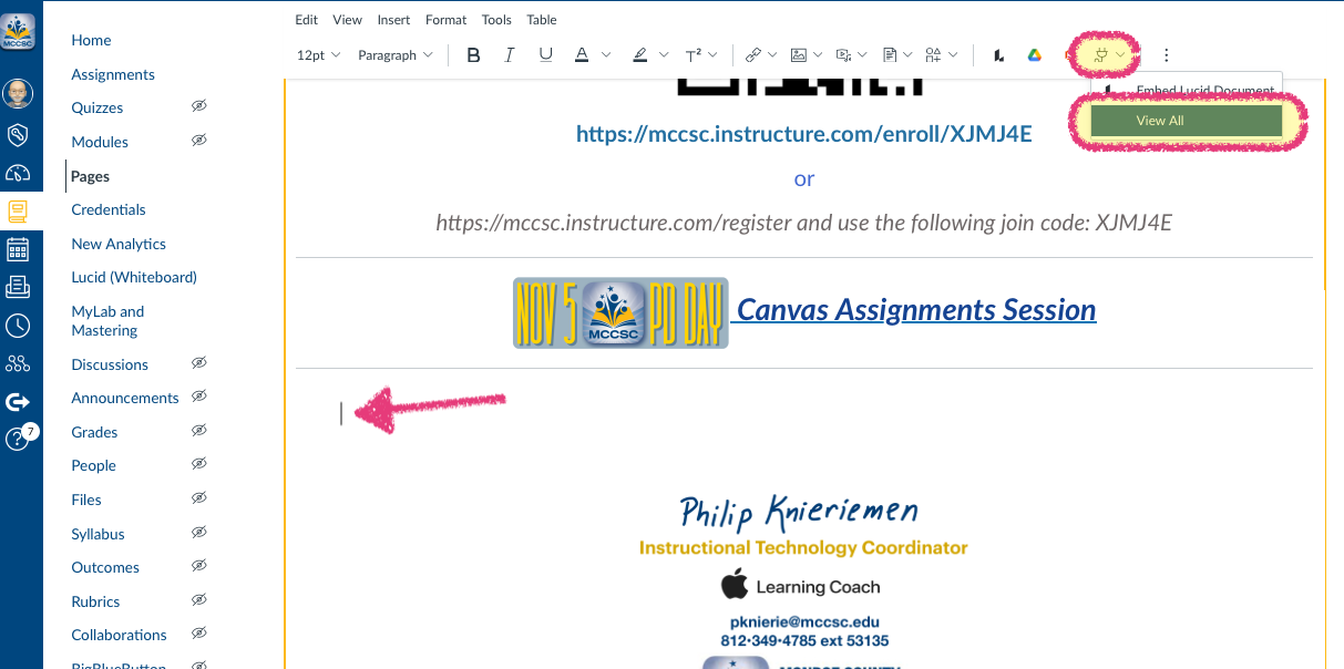 Open the Canvas page where you want the link, place cursor where you would like the link to be placed. Next, click on the "plug" icon and select "View All".