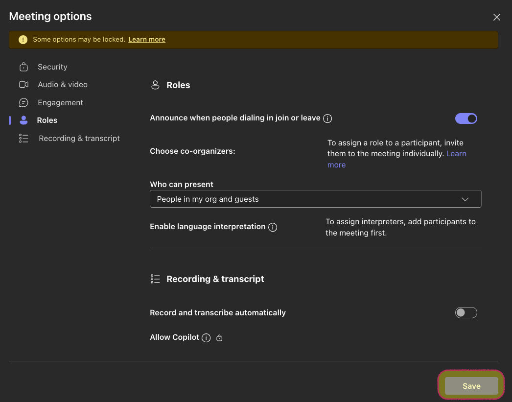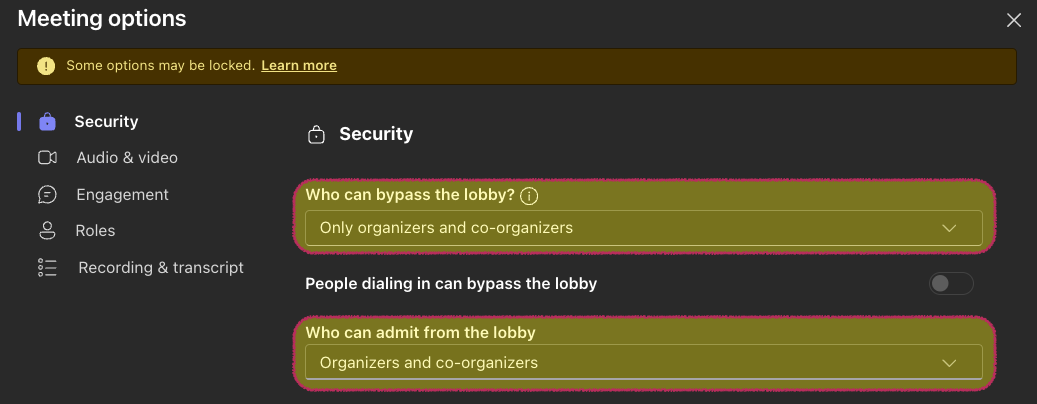 - Under "Security", be sure to have "Only organizers and co-organizers" select for who can bypass the lobby. This ensures that students cannot enter and access the virtual meeting space without the teacher present.
