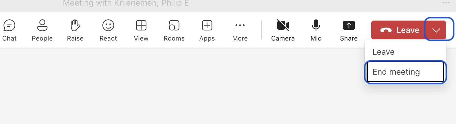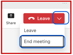 **IMPORTANT** At the end of each session, the teacher must select the drop down arrow and then "End Meeting" to close the meeting space for all participants. If the teacher clicks "Leave", the space will remain open for students to continue on in the space without teacher supervision