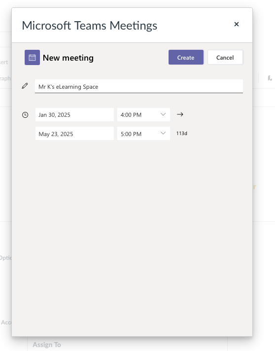 Enter the name you want to give your meeting and set the start and end dates. (It is recommended to set the end date to the end of the course so that you can use the same link repeatedly as needed). When finished, click the "Create" button.