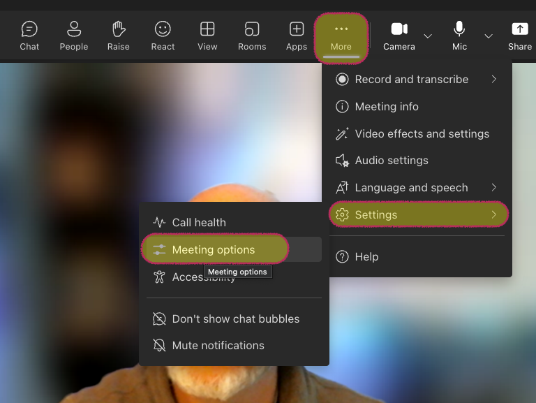 - After launching meeting, click on "More" -> "Settings" -> "Meeting options" to configure the settings for your meeting space.