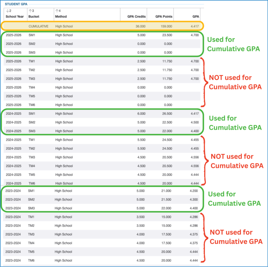 This article provides additional detail for understanding high school GPA information that is displayed and how the Cumulative GPA is determined. Ultimately, the Semester grades reflect the final outcome in each course, so ONLY the semester GPAs are used when calculating the Cumulative GPA.